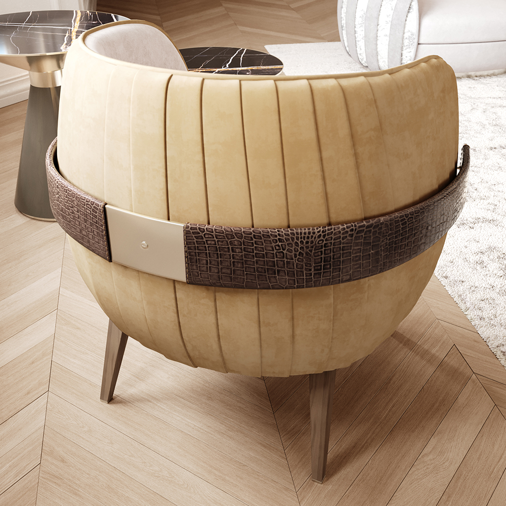 Кресло на ножках из массива дерева, сиденье и спинка с тканевой обивкой с внутренней стороны, спинка с наружной стороны с обивкой из кожи плиссе и с декоративным кожаным ободом и металлическая пряжка c возможностью индивидуализации.