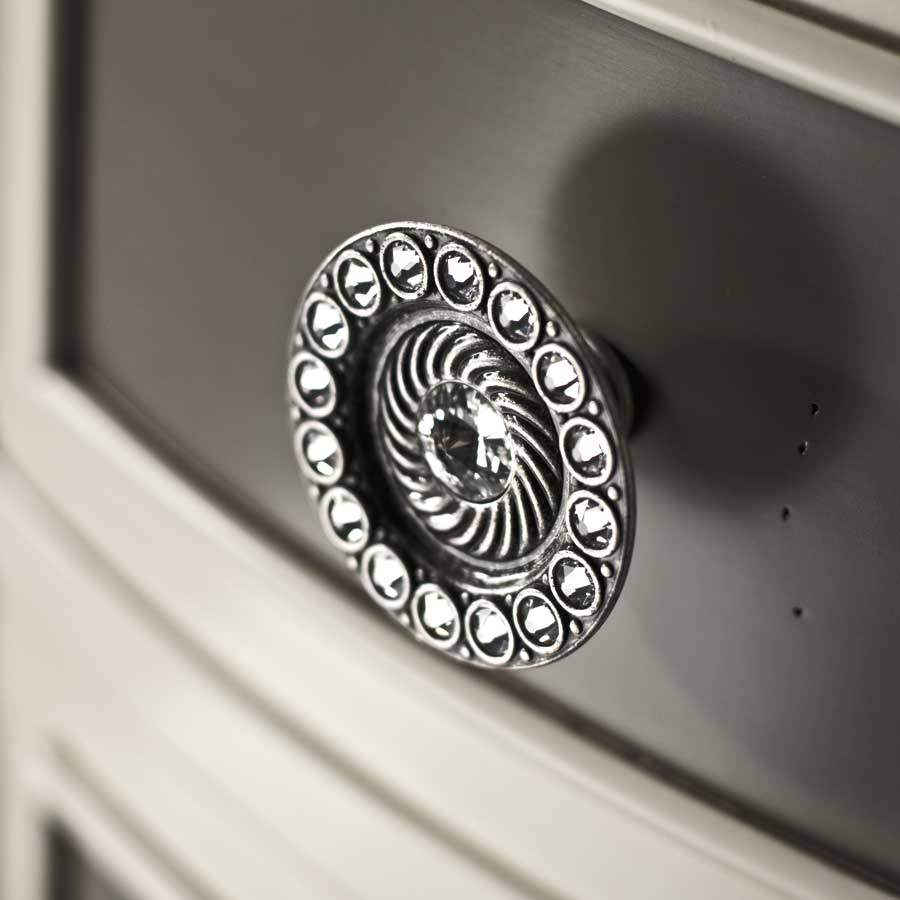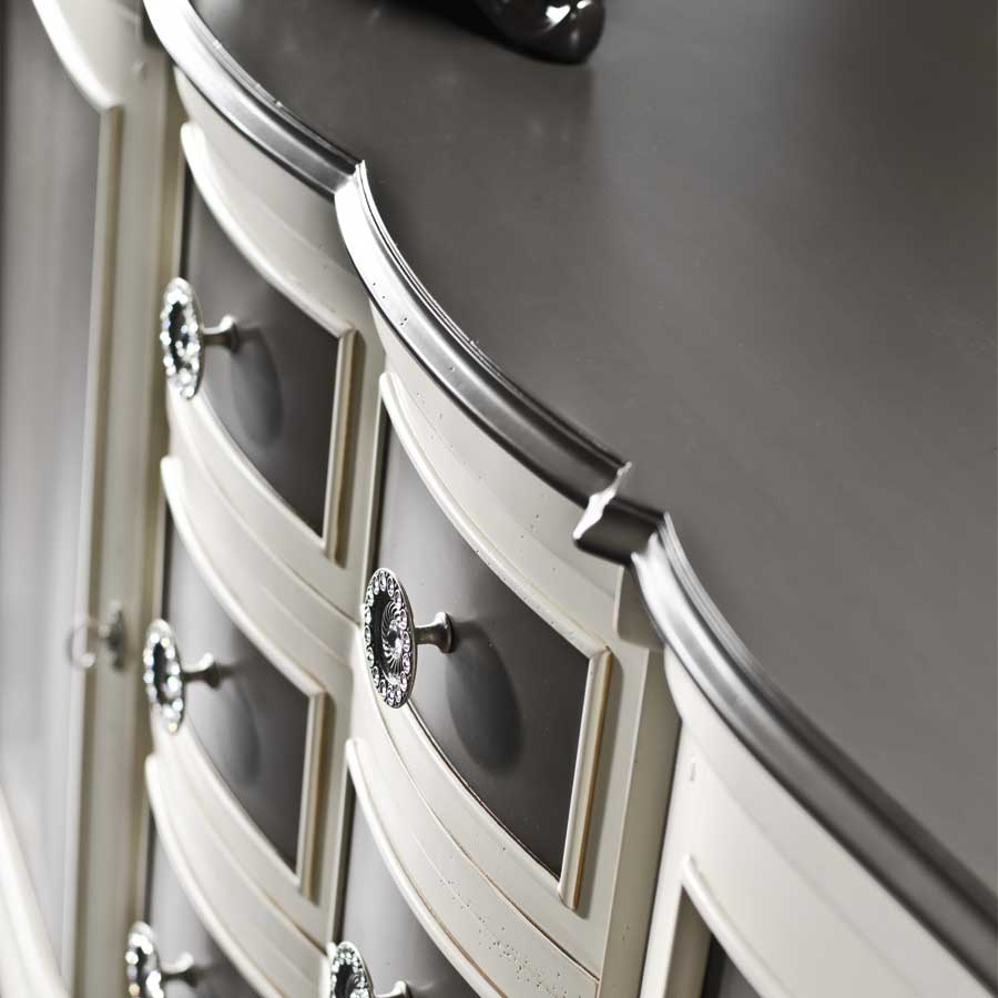Буфет с двумя дверцами, четырьмя выдвижными ящиками. Каркас из блок-картона с рамами из массива липы. Боковины и дверцы из блокборда, ящики из массива липы с многослойным дном, облицованным, как и полки и спинка. Латунные ручки в отделке под античное серебро или античное золото со вставками Swarovski®.